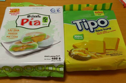 タイの食材店 LIU SHA PANDAN PIA CAKE (BÁNH PÍA KIM SA DỨA) 300kcal/100g Tipo durian cream egg cookies パリッと美味しい卵クリームクッキー! (ドリアン味)220g 豚の耳 350円 胡麻煎餅 210円 450kcal/100g An ChÀ BÔNG 450円 ミックスビーンズスナッ…