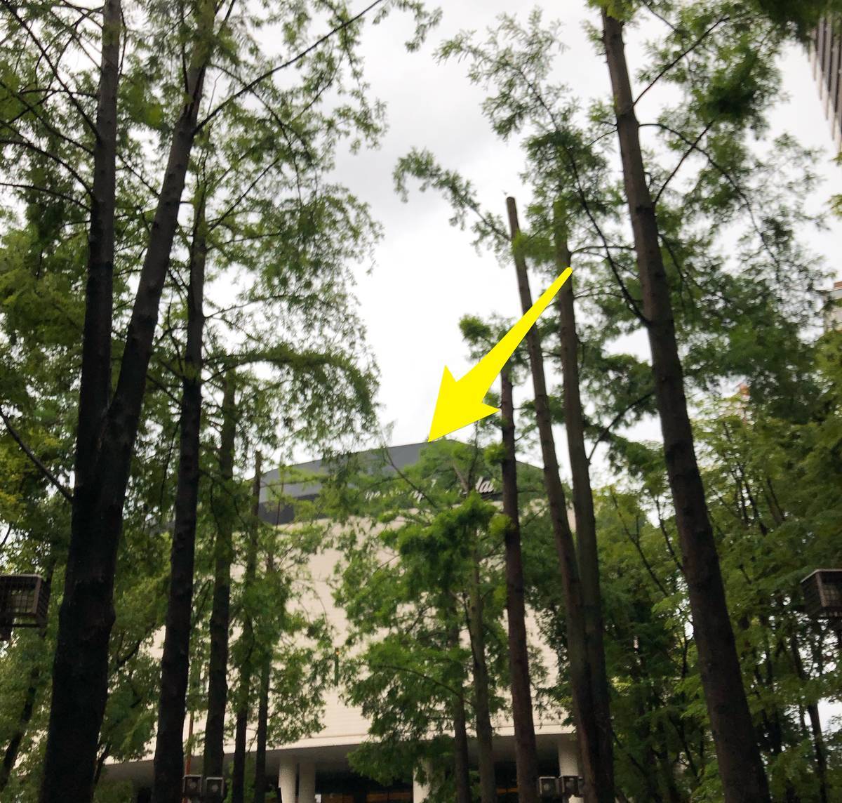 The Symphony Hallの文字が見える 黄色の矢印
