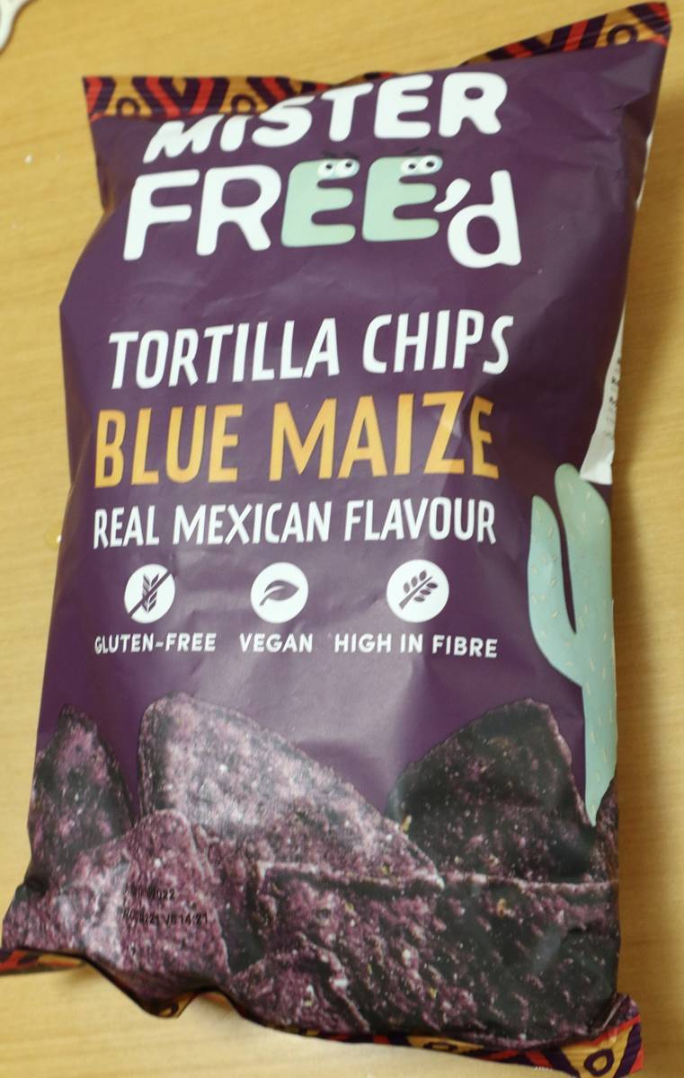 - トルティーアチップス ブルーコーン シーソルト味 369円+税 135g 479kcal/100g