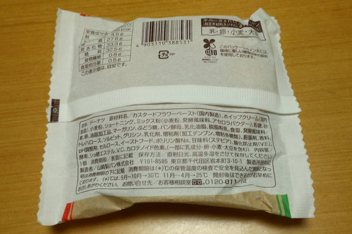 原材料 カスタードフラワーペースト(国内製造) ホイップクリーム(国内製造) 小麦粉 ショートニング ミックス粉(小麦粉 発酵風味料 アセロラパウダー) 粉糖 砂糖 卵 油脂加工品 マーガリン ブドウ糖 パン酵母 乳化油脂 脱脂粉乳 食塩 発酵風味料/トレハロース ソルビット グリシン 乳化剤 増粘剤(加工澱粉 増粘多糖類) 膨張剤 香料 pH調整剤 セルロース イーストフード ポリリン酸Na 甘味料(ステビア) 酸化防止剤(V. E) 酵素 ショ糖エステル V.C カロテノイド色素