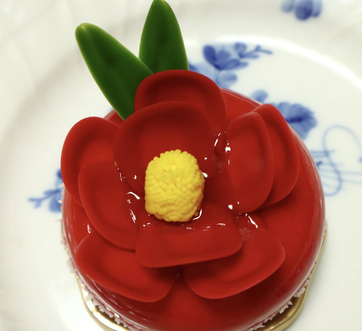 冬に真っ赤な花を咲かせる寒椿をモチーフにしたケーキや