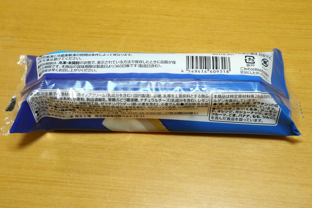 原材料 ホイップクリーム(乳成分を含む)(国内製造)、砂糖 乳等を主原料とする食品 鶏卵 水あめ、小麦粉、脱脂濃縮乳、果糖ぶどう糖液糖 ナチュラルチーズ(乳成分を含む)、レモンピューレ、マルトデキストリン 油脂加工品、ゼラチンパウダー 小麦でん粉/乳化剤(大豆を含む)、加工澱粉 酸味料、膨脹剤、香料(乳成分・大豆を含む)、カロテノイド色素 pH調整剤、安定剤(加工でん粉)